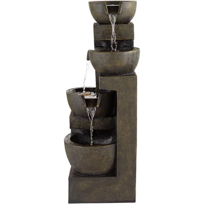 - Modern outdoor water fountain. Four levels of bowls, with water flowing from spouts to lower levels. From the John Timberland brand of fountains.