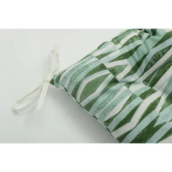 Large abstract tropical foliage in bright shades of blue, green and turquoise pops from an off-white ground with this set of two outdoor tufted chair cushions. The pattern is printed on outdoor fade-resistant polyester fabric that has a slub texture for added dimension. Additional features of these outdoor tufted chair cushions include 14-inch ties and recycled polyester fiber fill with sewn seam closures. Also suitable for indoor use.