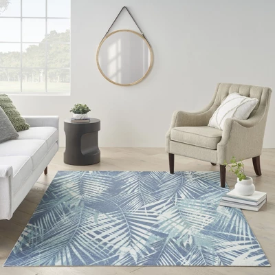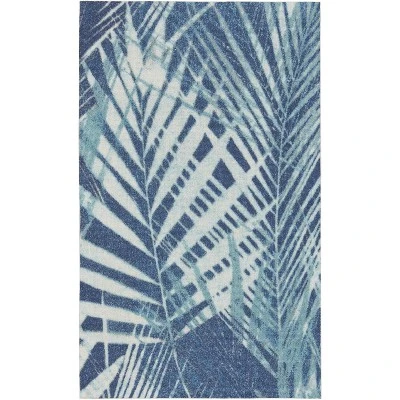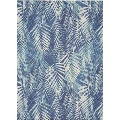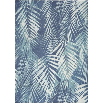 Create a fun and exotic vibe that’s all your own with the St Croix tropical outdoor rug from the Waverly Sun N’ Shade Collection. A pattern of overlapping fronds projects a sense of movement and depth against its deeply pigmented navy-blue ground, making this an eye-catching foundation for your indoor or outdoor décor. Machine made of polyester in a low-profile design that you can easily place in high traffic areas such as the living room or dining room, or onto your patio, porch or deck.